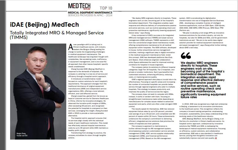 凭智运保TIMMS - 全集成医疗设备运维与管理服务创新模式和智管家 iButler系列软件,爱德亚医疗被美国《MedTech Outlook》杂志认定为2024年度亚太地区最具市场影响力的医疗设备运维服务Top10企业之一。 https://www.medicaltechoutlook.com/idae-beijing-medtech